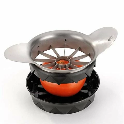This is certainly true of the Tomato/Apple Cutter Pomo with an automatic cutting guide to slice tomatoes or apples into 12 juicy and sizeable chunks. Your salads will really shine with this genius Gefu gadget.