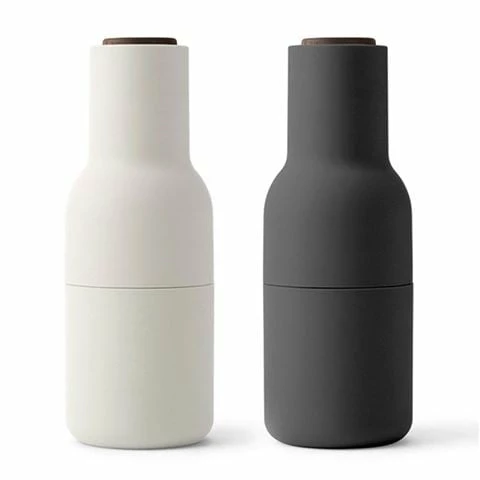 The Bottle Grinders by Menu are not your typical salt and pepper grinders. The form, shaped more like a bottle, cleverly tricks the user to engage with the design in a playful and experimental way – and the powerful ceramic mechanism encourages even further experiments as it tackles a wide range of dried spices, seeds, salt and pepper. Designed by Norm, these Bottle Grinders are easy to operate, full and clean. The Bottle Grinder comes in a range of beautiful, soft Scandinavian colours combined with steel, beech or walnut lid and is now extended with the addition of a brushed brass and bronzed brass version.