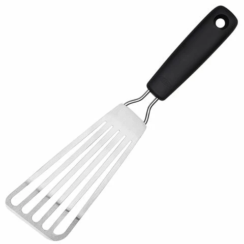 This handy Fish Turner when cooking whole fish, seafood cakes and more. The beveled edge slides easily beneath foods and the slots in the head allow grease to drain.