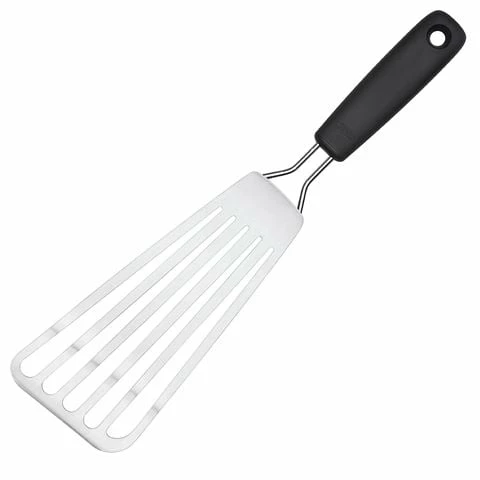 This handy Fish Turner when cooking whole fish, seafood cakes and more. The beveled edge slides easily beneath foods and the slots in the head allow grease to drain.