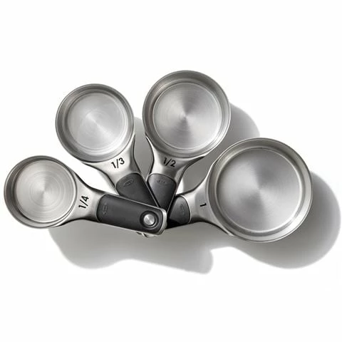The Stainless Steel Measuring Cups Set are nested together with magnetic handles for easy storage. Designed to make measuring ingredients easier, they have measurements etched into the handles. They’re also soft and comfortable with non-slip grips.Â