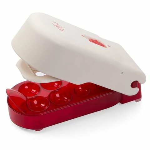 The Cherry-It Cherry Pitter is a clever invention that makes it quick and easy to pit cherries. Just position the fruit in the holders and press the lid down – the metal spikea poke out the pits into the storage container below, without the need for nifty knife work and without messing up your bench. And it does four cherries at once, so you’ll really be saving time.
